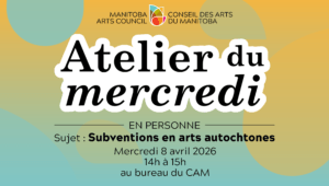 Cet Atelier du mercredi portera sur la subvention « Artistes à l’école » du CAM, qui finance des projets artistiques et culturels dans les écoles du Manitoba, animés par des artistes professionnels comme vous ! QUAND : le mercredi 13 mai de 18h à 19h OÙ : Zoom Les Ateliers du mercredi sont une série de rencontresLire davantage