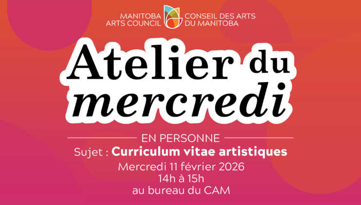 Cet Atelier du mercredi sera consacré à la préparation de votre CV artistique, un élément essentiel de toute demande de subvention ! QUAND : mercredi 11 février de 14h à 15h OÙ : en personne au bureau du CAM (93, ave Lombard (5e étage), Winnipeg) INSCRIPTION : envoyez un courriel à Violet à l’adresse vhoussin@artscouncil.mb.caLire davantage